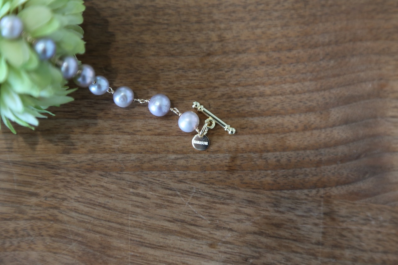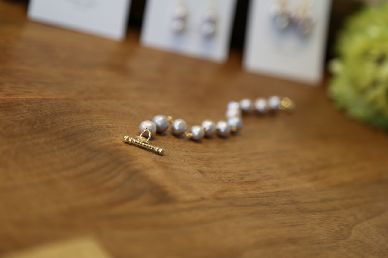 眼鏡留めで連なったパール達。重厚で美しいブレスレット。このパールならフォーマルにも見劣りなし。